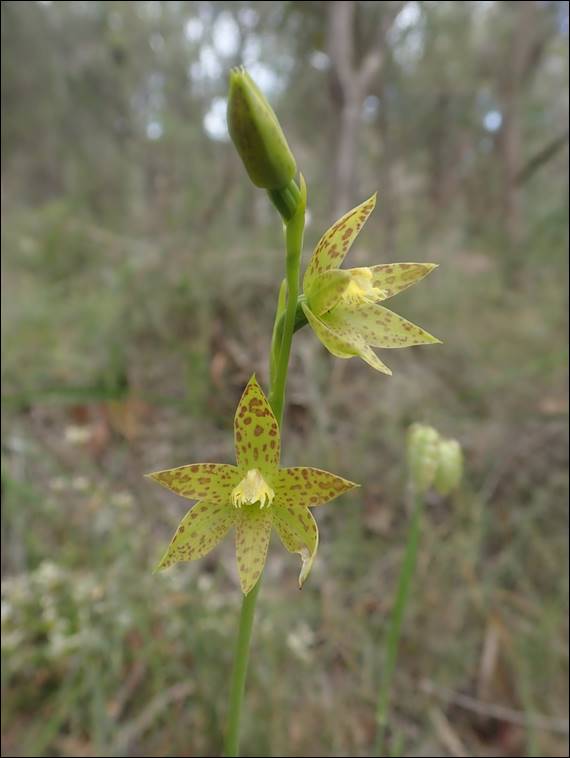 The specimen two images above initially had me stumped, but now looking in more detail it is probably another Swamp Spider Orchid. Similarly the one below, which is the taller of the two plants in front of the trunk in the above image, had me foxed. But now I am confident it is a Rusty Spider Orchid, and flicking between images in this post you can see how much each species can vary in appearance. The final image from Ambergate is yet another spider orchid and this one I am hoping is something different, but I can’t figure it out: