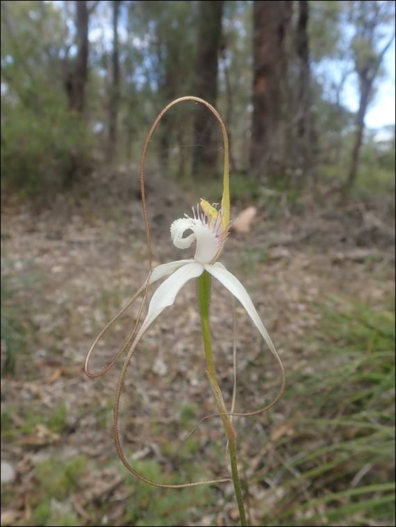 Being the Leopard Orchid (Thelymitra benthamiana), and like the Slipper Orchid I have to date only spotted one before: https://sandbagged.blog/2020/10/18/creepy-crawlies/. This year however it is a bumper year, this place was littered with them and Manea Park also looks like it will have a bumper crop of them too. It was a surprisingly good spot and I also spotted some Sandplain White Spider Orchids (Caladenia speciosa) shown in the next image, and as I was driving out I saw an elderly couple obviously also on the hunt. I stopped for a chat and they too had been advised of the bounty of Leopard Orchids here, and we got chatting: