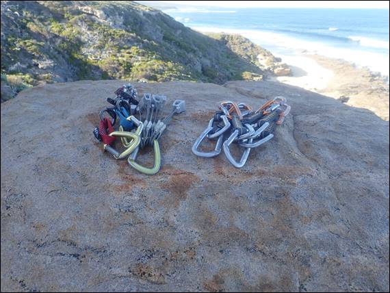 In selecting the climbs we applied a few criteria, which included only considering traditional routes (i.e. no bolts) that were between grades 13 to 19. Or in British climbing speak HS 4b to E1/2 5b. While 305m may not seem too bad, the route length at Wilyabrup averages around the 20m mark. As such it meant packing in a few more lines than a normal morning out, plus with multiple short’ish routes we would have more belay stations to set up. We would also have to walk back down to the base quite a lot, as we had also set ourselves a condition that we would not abseil to get back down: