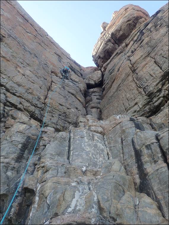 Rongy was on a time schedule needing to walk out by midday, and as such I hoped I had not underestimated how long it would take otherwise we would not get all the routes in. Our confidence was boosted as we knew the lines well and are both reasonably efficient climbers. But to save on time we made sure the gear was ready for the second person up, so they could quickly get ready to lead the next climb. We also focused on neat rope work, to ensure we were not delayed by having to unravel a knotted mess. Added to that and to speed up the descents we took our shoes up with us. This provided an added benefit of giving our toes a bit of relief from being stuffed into our climbing shoes: