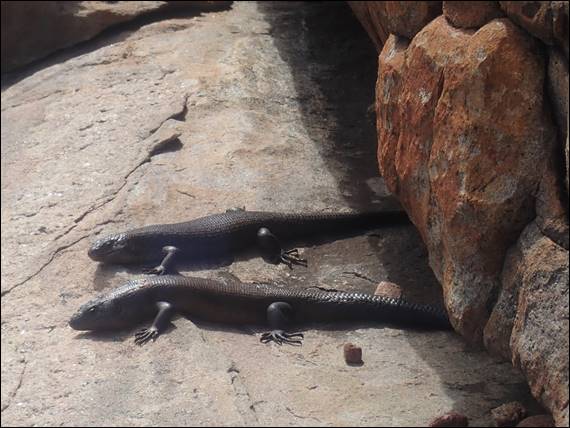 Unbeknown to us, a tour group operator was getting ready to set up ropes above the wall, and they threw a line down without checking below. The guilty person was very sheepish afterwards, and rightly so it was both sloppy and dangerous of them not check below first. Fortunately they didn’t knock Rongy off the cliff, but their arrival meant we once again had to revisit our plan of attack. Once more shuffling the route order to now hit the climbs on the walls the group proposed to set up top ropes and abseil lines on. As we kept cranking, every so often Sarah would pop by, and as fortunate would have it at the top of the ninth route she wandered by just as these two good sized King skinks (Egernia kingii) came out for some sun: