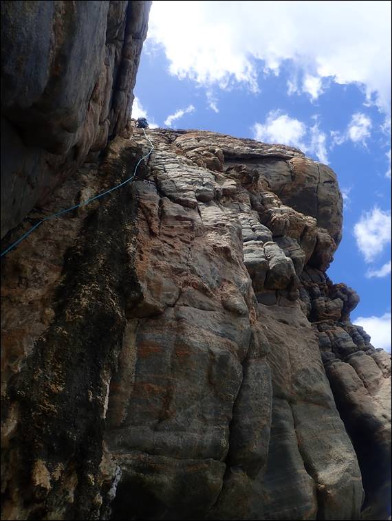 We started well and as we closed in on the half way mark, climb number six, Rongy showed signs of becoming weary. He has not been out much recently, and while I took the lead from him Sarah wandered past and Rongy confessed to her based on how he felt he wasn’t sure if he would be able to complete the mission. I didn’t know this but seeing he was weary, we had a chat and adapted the plan. Rather than alternating the leads he could pick which lines he would go on the sharp end. Having a rope above you on a climb, usually results in using less energy so by me leading the tricky lines that were left he would hopefully conserve his strength for when he really needed it. Although he might have regretted picking the climb below: