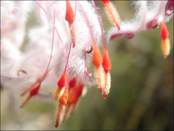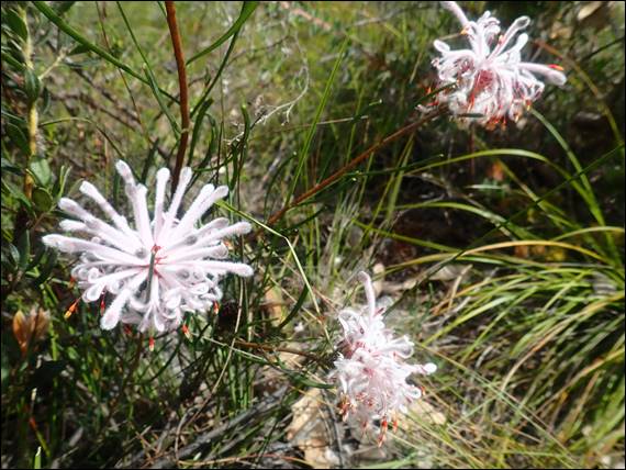 It is not an uncommon plant and can be found in woodlands and heathlands along the coastal plain stretching some 400km down the coastline of Western Australia, from Jurien Bay to Yallingup. Although it has also been found in some areas along the south coastline. While common to see I really like these flowers. Like the Rose Coneflower (Isopogon dubius), which also grows in Ambergate Nature Reserve where Lisa and I were walking today, it has delicate protrusion that come out of the end of each limb of the flower, as shown below: