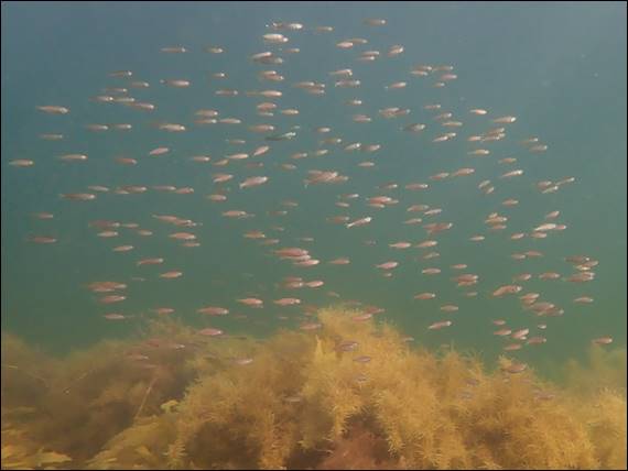 I was interested to read that they are known to quickly change colour, and can become more brightly-coloured at night. Something for me to look into another time, as you may be wondering what the next image is all about. Well I heard the obvious trill and squeak sounds of a Bottlenose dolphin (Tursiops truncatus), which I thought sounded some distance off so I looked up for any signs of dorsal fins. When I popped my head back underwater all I saw was the fuzzy outline of a silhouette, as a single large adult swum approx. 10m away from me. Like I said the conditions weren’t perfect but I had no complaints and thoroughly enjoyed finally being back in the water: