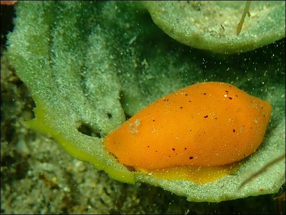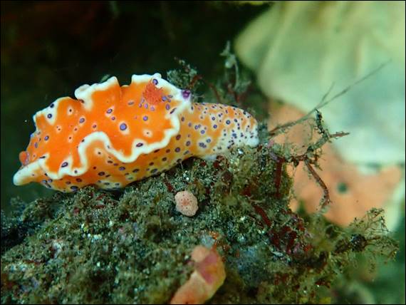 My next find was a shell and I would not normally try to identify them as like the weeds I find them very challenging. This one however was spectacular. Based on the shape this could be a Strombs Shell, of which I found one specimen (Strombus luhuanus) that had a somehow similar colour (http://www.stromboidea.de/?n=Species.ConomurexLuhuanus). The shape is also similar to Cone Shells such as Conus bullatus, although the coloration of these from what I have seen is generally more speckled. Looking at the images of the shell I found, it looks to be covered in a fleshy substance that is orange with tiny white spots. You can also make out the foot of the gastropod that lives inside, being a slightly paler orange colour still with tiny white spots. Sadly, despite multiple duck dives, I never got to see the eye stalks nor proboscis: