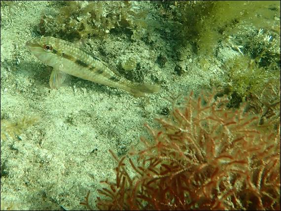 Not all Cormorants have well developed preen glands, which seeing they are in the water a lot may seem counterproductive. However, the oil would make them more buoyant and limit their ability to fish underwater. Instead, like many water birds, can have feathers with a tighter structure to slow down the rate at which water can get between each bard of the feather and saturate them. That is why we commonly see cormorants perched with wings outstretched, drying them ready for the next foraging session. The next fish I see most times I go out but rarely get very close too, being a Bluespotted Goatfish (Upeneichthys vlamingii):