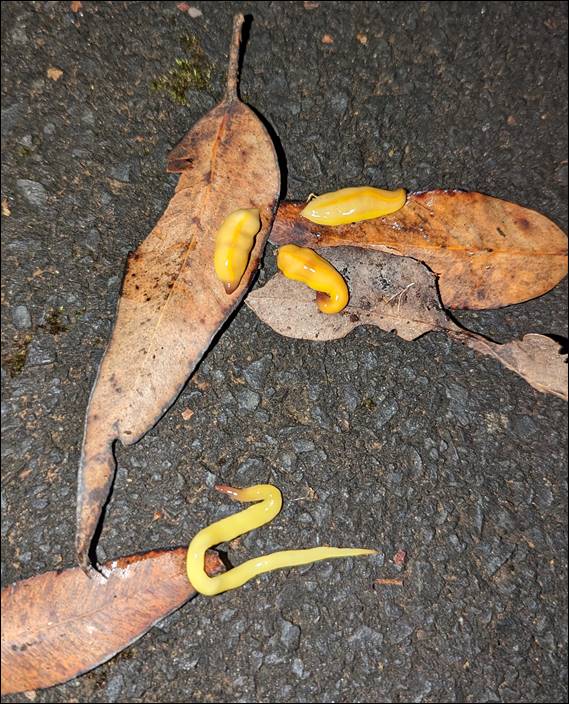I kinda wished I had stayed up, as Rongy and Sarah went for a night walk to see what they might see. There was not a lot out, one more scorpion and a wonder blanket of stars above. I saw the latter later that night, when I got up. But what would have been really cool to see were the above Canary Worms (Fletchamia sugdeni). These worms are found across Tasmania and Australia, preferring extremely wet and dark forests. They are flatworms, which can be understood looking at the top three in the image, but they can and do also stretch out into skinny worms with a brown coloured head: