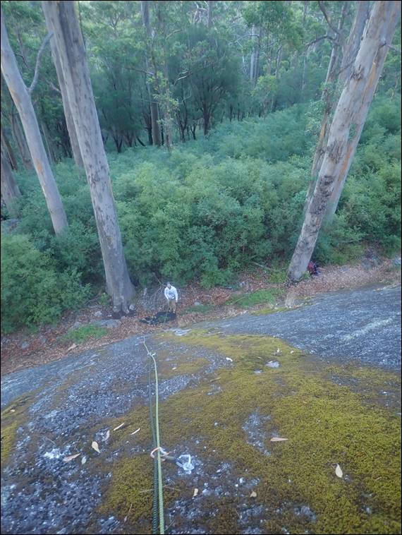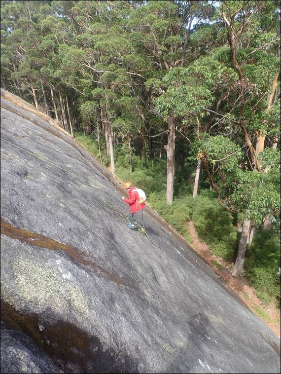 Before we could get back to the car we had to rap down the lower slabs. Sarah went first and she got her first taste of having to sort a tangled rope, while hanging on the rope. Rongy had suggested he should go first, but we all agreed that it was a good learning experience for Sarah. So if she ever comes across the same problem in a less comfortable situation she will have a better idea of what to do and what it feels like. I’m not sure is she agreed, but managed to keep cool all the same and it worked out just fine:
