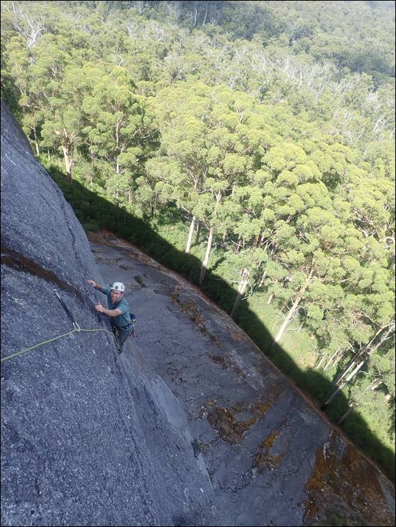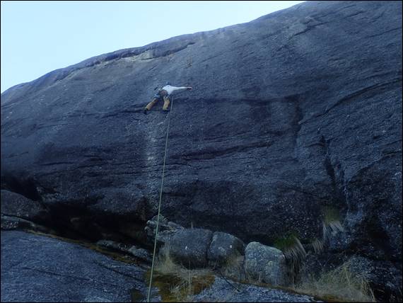The second reason for coming here was to give Sarah her first taste of true slab climbing. It is a very acquired taste, and not for all. If you check the image above of Rongy, you’ll see he is only using friction to stay on the rock. Slab climbing requires slow, controlled moves, and if just one point of contact slips you will invariable take a fall. As such you are continuously on edge, using body tension, and thinking hard. Sarah has had a real initiation of fire into climbing and is still loving it, but after one long pitch of slab was more than happy for Rongy to join us for Hannibal: