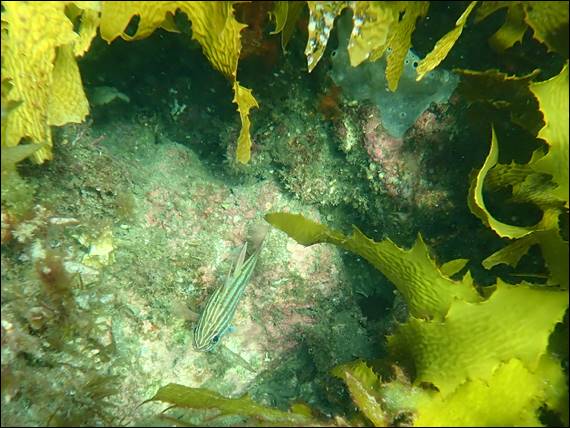 To my surprise, and for the first time I have seen it, several people were fishing off the beach right on the spot where I normally head in. It’s the area with the best bit of reef, and normally people fish in the open sandy bay away from this area. The open sandy areas also being the place I have seen the most shoals of herring, so my guess is that the people fishing were not local and didn’t have that knowledge. To avoid their lines and upsetting them I went in the open areas and swam further out to the reef: