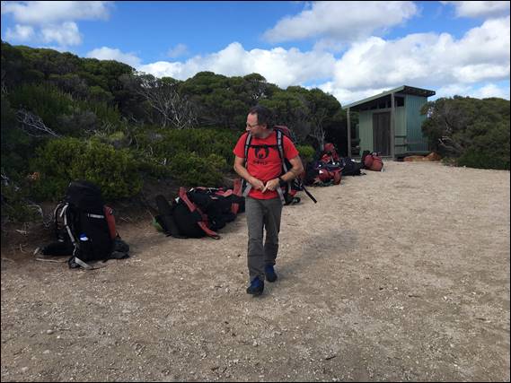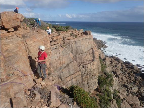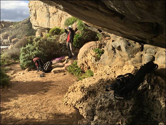 It was therefore entirely possible when we got to Wilyabrup that we were going to find a crag with water seeping down the cracklines and runnels. On arrival our first surprise was a full carpark and my usual spot for parking being taken, which may be a first. Fortunately, most of the cars belonged to walkers. Other than us there was only small school group who were squeezing in a couple of abseils, in-between two legs of hiking the 14km’ish from Gracetown to Moses Rock on the Cape to Cape track. It was this group that had stored all their rucksacks near the toilet, as shown in the first image: