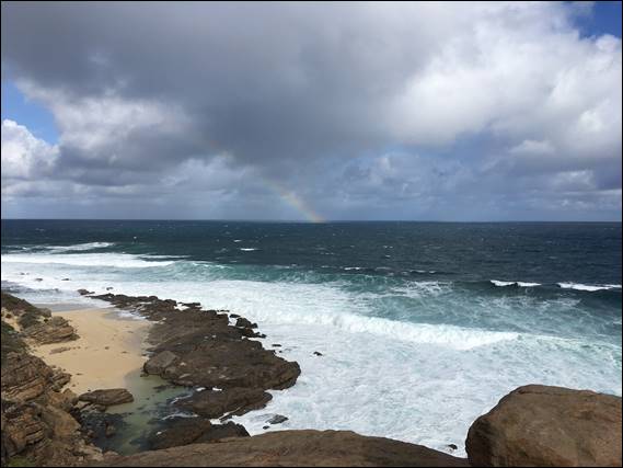Ahead of me, to the west, dark clouds loomed fronted by stunning displays of rainbows. Then, as I drove into the belting rain the rainbows disappeared from sight and I pondered my decision. I admit that at times I can be a little stubborn. If I have an idea or plan, even when things suggest it may not be the wisest, I can at times forge on regardless. Today was one of the those times, and not surprisingly I was heading out alone. Less surprisingly and despite not getting to the carpark until just past nine it was empty, as was the crag for my entire visit: