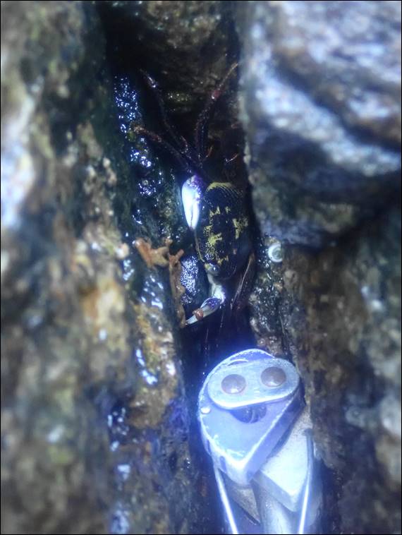 I asked Josh if he had any preference of routes, and he didn’t really mind but did say he had never climbed in the zawn. To make sure it would be safe today we sat at the top looking down, watching the waves come and go for a while. It certainly was not ideal conditions. The boulders at the base were all wet and green, and the base of most of the walls also looked slimy. However, the waves did not seem to be reaching the far corner, and as the tide was receding this could only improve. Josh was keen, and I didn’t need any extra encouragement: