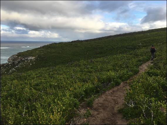During COVID times Bob’s became very popular and it was not uncommon to find up to fifty people here, which based on the number of climbs is very busy. Today, walking in, we were pretty sure we would have the place to ourselves. Not only because it is winter, but as per the forecast early belts of rain floated above the ocean, threatening land fall. Walking on regardless of the view out to sea, there was a distinct difference with the scenery. My Walking in Circles book describes the landscape vegetation in this general area as being a mix of Holly-leaved Banksia (Banksia ilicifolia), Western Sheoak (Allocasuarina fraseriana) and dense coastal heath:
