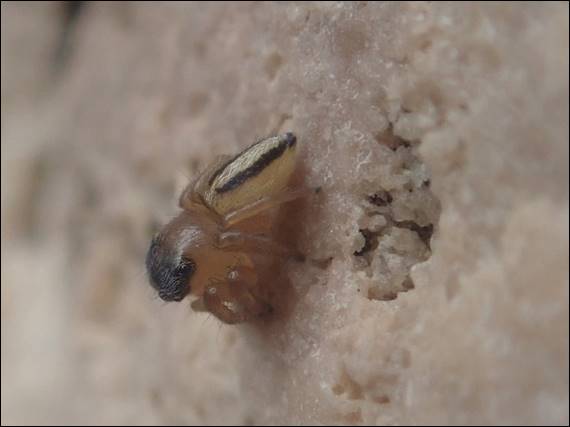 Relishing having the place to ourselves, mostly dry rock, and the right attitude to what we could achieve today I also kept an eye out. Spotting Welcome Swallows (Hirundo neoxena) flying in and out of their nests made of mud that were safely tucked away in the many holes in the rooves of the caves, and occasional Nankeen Kestrel (Falco cenchroides). The former darted about catching insects on the wing, while the later skilfully used quick shallow wingbeats to allow it to stay horizontal in one position as it searched for prey. There were also a few spiders out, and the above tiny specimen caught my eye despite only being approx. half a centimetre long: