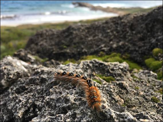 With some 5,000 species of jumping spiders I didn’t fancy my chances, but am fairly confident that this is a female White Garland House Hopper (Maratus scutulatus). This species is common in coastal locations, including in the South West of Western Australia. Despite their miniature size jumping spiders are known to be efficient and stealthy hunters, just like a cat they pounce on their quarry holding nothing back. For such a small creature I was also surprised to read that if they bite you it can result in local pain/inflammation, and at times mild illness. My next find can also cause us humans pain, if we are foolish enough to get too close and allow the stiff barbed hairs penetrate our skin: