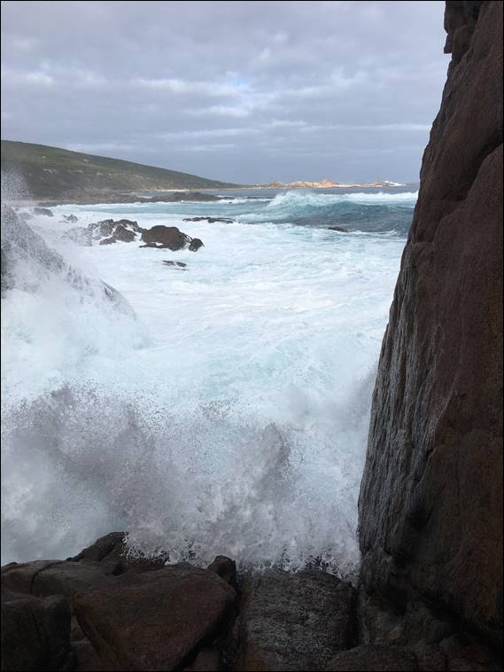 Howsie popped up to Welly Dam on Friday and told me every route was running with water, which is unusual. Due to the steep walls there, normally one or two lines are dry enough to be climbable. The conditions steered our thinking towards Smiths Beach, which like Moses Rocks has amazing friction so it didn’t matter if the rock was wet. Of course it was wet, although it was more because of the rough swell that was crashing at our feet. As we drove in the bay of Smiths Beach was full of people surfing, but many of them would feel confronted by standing were we were now: