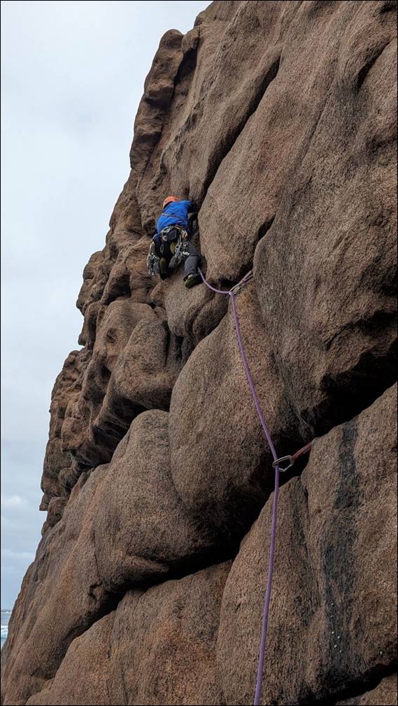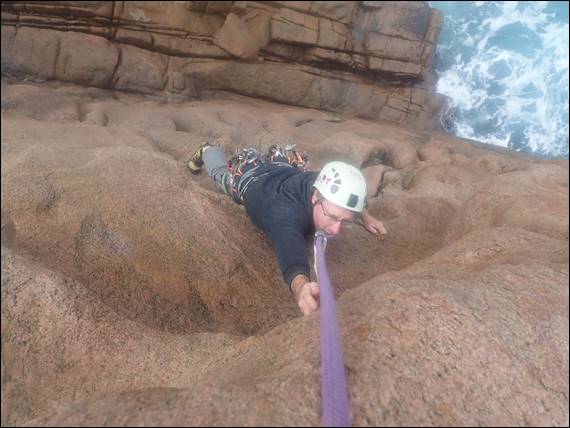 We of course applied good safety practises being in such a location, although at the very start before we had even started climbing I was caught out and got drenched from head to toe. As I stood looking out across the bay I noticed the water dropping at the end of the zawn, as a clean wall of water came in. A sure sign that when the wave smashed into the rocks water would be sent high into the air and sure enough all over me. At times like this it is best to brace for what is coming rather than trying to run away from it, which due to the terrain would likely result in a fall and probably a more serious injury: