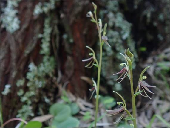 The key way to tell these apart is the labellum, with the Midge Orchid’s being narrower by a mere 1mm and a darker shade. I’m fairly sure based on what I saw today, along with the height and number of flowers on some stems that it may be the less often seen Mosquito Orchid. But that was not why I drove here today. During a second visit here Josh had, just a few hours earlier, shared an image of something far more exciting. The Helmet Orchid (Corybas recurvus), a genus I have had on my wish list for a while now: