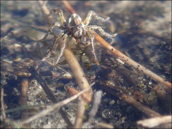 I didn’t see any frogs, but did spot the above spider skating across the water. I thought it may have been a species of Water Spider (Dolomedes), but the configuration of the eyes did not match up. Water Spiders have the two rows of four eyes, whereas this spider had a bottom row of four with two rows of two above. This configuration is akin to Wolf Spiders (Lycosidae) and the body pattern also matches this family, which gains its name from an Ancient Greek word “lycosa” that means wolf. An apt name because this spider stalks its prey, like a wolf: