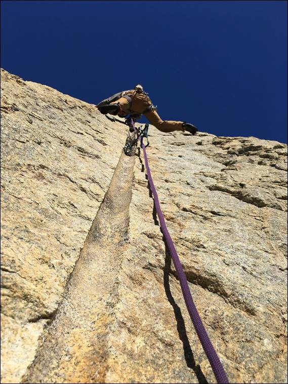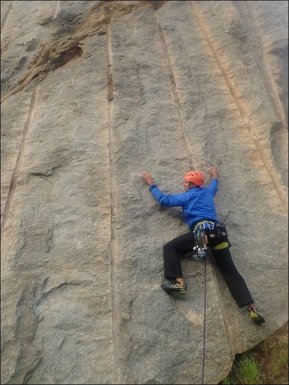 We moved from right to left picking of one line after another, and half way along the sun started to peak over the opposite hillside. As it rose higher in the sky it seemed to banish the shadows back into the depths of the earth, and we relished the warmth that came with the transition. The sun also started to dry the left-hand end of the crag, and by the time we got to the routes at that end there was but a mere dribble of water to be found on the face. Howsie was starting to show signs of tiring, but he had obviously enjoyed the thrill of the cams: