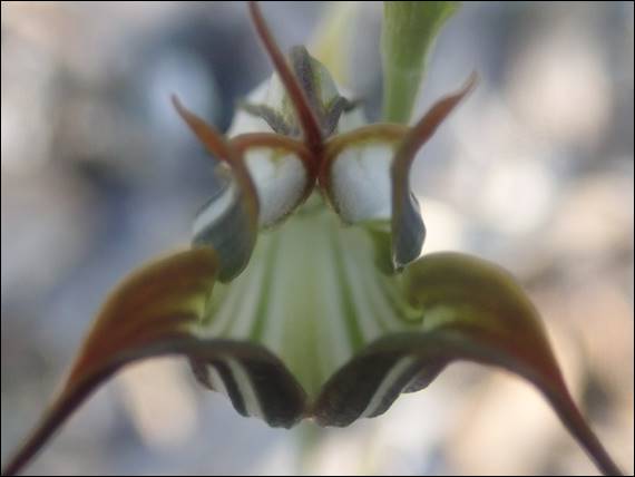 During my nature walks at the homestead, and those for my own pleasure, I have only had success in finding an Antlion once. Pushing my hands round and under the pit and sieving the sand out through my fingers, so it was really cool to the one Pat found. I’ve described the insect luring and trapping nature of Greenhood Orchids several times, but unlike the Antlion I thought they did not consume the insect merely use them to facilitate pollination. Done by forcing them to escape the trap and brush past the stigma to deposit any pollen on them and then the anther to collect pollen from the flower. The above and below images are taken from the top of the same Jug Orchid (Pterostylis recurva):