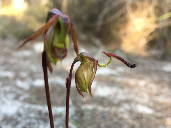 Taken before and then after I managed to trigger the labellum, by giving the flower head a little shake. This was enough to trick the sensitive-to-the-touch labellum into thinking an insect had landed on it. In the second image it has sprung towards the back of the flower, an action that traps the insect and forces it to crawl up past the stigma and anther to escape. For those keen I have found a website that has some great imagery of this, and a theory that the plant-insect relationship could include the need to trap and kill a gnat after pollination (https://www.foxeslair.org/foxypress/shell-and-jug-orchids):