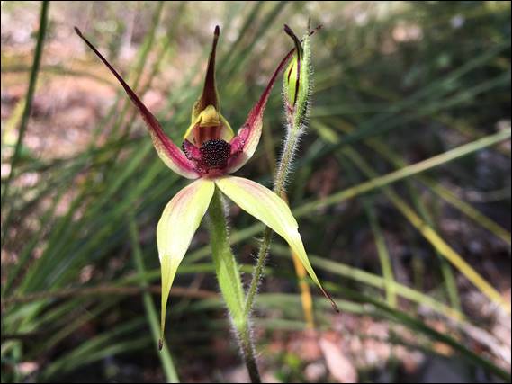 Other than the first image of the Antlion the others until now and below are from a wander at the Capel Nature Reserve on Thursday. Knowing how mosquito ridden this place can be I wore closed in shoes, which is a rarity for me. This helped minimise the number of successful strikes these pesky insects managed to get. Things had certainly progressed here. The first image is of one of the many Sandplain White Spider Orchid (Caladenia speciosa), and below is the only Flying Duck Orchid (Paracaleana nigrita) I found in flower. But the above orchid, which was just starting to come out in numbers, is the one to go here for. The Chapman’s Spider Orchid (Caladenia chapmanii) is, in my opinion, one of the most spectacular spider orchids: