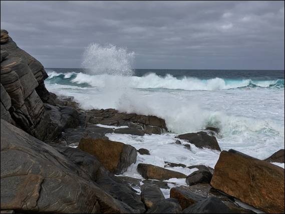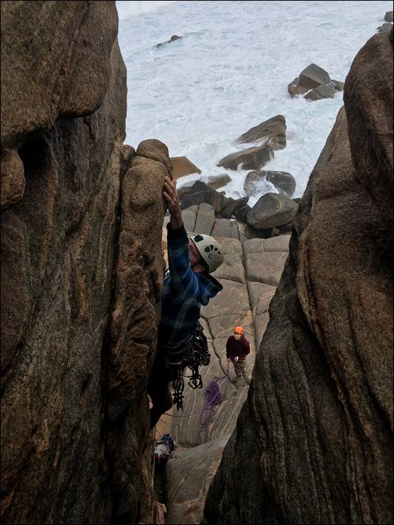 Fat Slags, above, climbs in a similar fashion to Rongy line but is just that bit steeper. Good friction is required to avoid popping off especially at the very start. Fortunately, despite the high tide, rough swell, and strong onshore winds, the rock was in great condition. These conditions did however keep us out of the Zawn, below, being the second area Sarah hasn’t climbed in. While I didn’t falter on my climb, Sarah made me almost fall over afterwards by saying she wanted to have a climb, on lead: