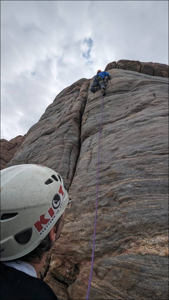 Not showing any signs of nerves and placing great gear, which is plentiful on this route making it a great beginners climb. Rongy couldn’t recall previously climbing on this small face, probably having walked past it numerous times and overlooking it because it is so short. But after climbing Sarah’s route, his eyes were drawn to the slightly overhanging wall to the left. Offering the slightly pumpy Blake and the Thoroughbreds. Maybe it was the steepness but Sarah wasn’t interested in that line, and had even taken her harness off: