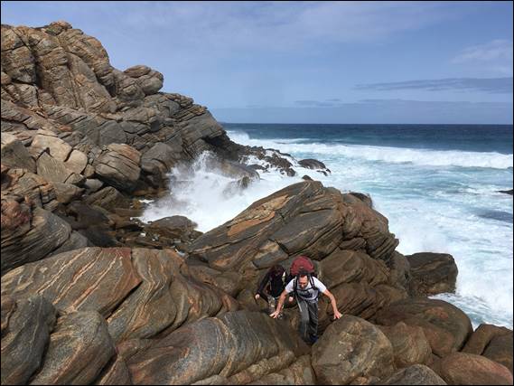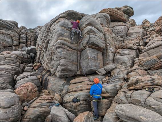 To give you an idea of scale, a small part of my thumbnail is at the bottom of the image, so some may say I’m forgiven for not having noticed the creature. Sarah surprised me one more time when she said she was keen for one more route, but this time on second. So her harness went back on, for Many Hands on wonderfully rounded holds to round of our time at Moses Rocks. While they may have thought the climbing was over I led them on merry way back to the car that included just a wee bit of scrambling: