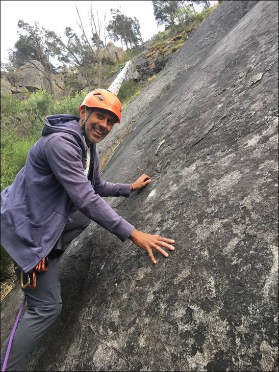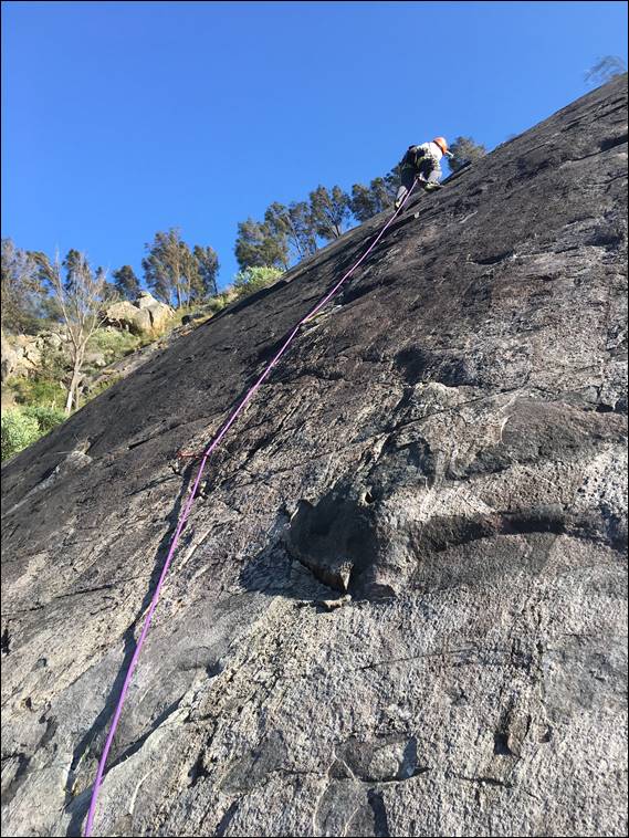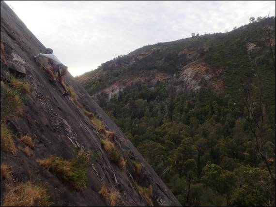 I’m pleased to say there were no more mishaps with nature from that point on. And Howsie and I relished the enjoyment of coming to a new location, needing to orientate ourselves. Firstly to find the place and then work out which line is which. We arrived at Wungong Slabs at 5:30’ish and the climbing began a bit before 6, with no sign of the sun, cloud in the sky, and a stiff cold wind blowing down the valley right across the slabs. Good slabbing conditions, and I’m normally pretty comfortable with the climbing style slabs require: