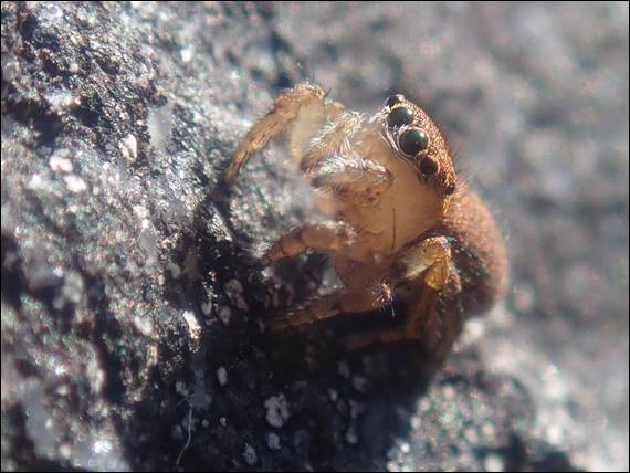 The two stripes across the back of the thorax, and triangular shaped abdomen making it an easy identification. The find below has however foxed me, and I’m waiting for Howsie’s entomologists friend to come to my rescue. Clearly from the Salticidae family, but being the largest of the spider families claiming 13% of known species I’ve had no luck in working out which of the 6,000 plus species it is. These spiders have a distinctive eye configuration and unlike other spiders, assisted with the enlarged eyes at the front, they are forward looking: