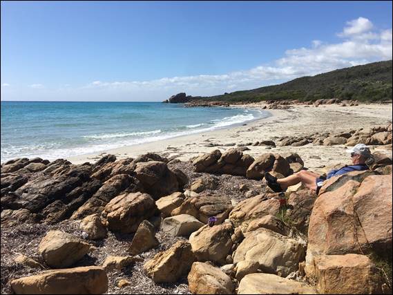 Firstly, it is generally calmer here than on the west coast, making whale spotting that bit easier. Secondly, the meandering path is lovely and takes in stunning views of the bays with their aqua blue waters before then branching out up on the ridge for views from on high. Lastly, we could stop in Dunsborough on the way out to grab a feed from the bakery, allowing us to start the walk by sitting down and taking it all in. The plan worked well, and as we laid back on the rocks munching away we were greeted to a few whales travelling northwards up the bay: