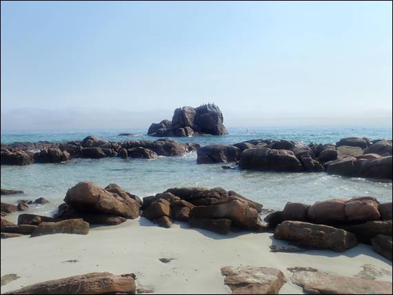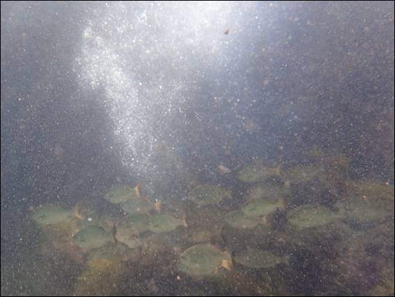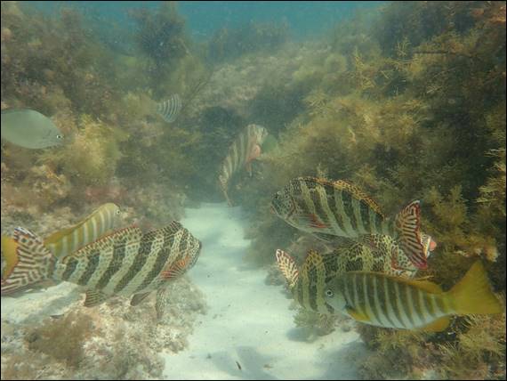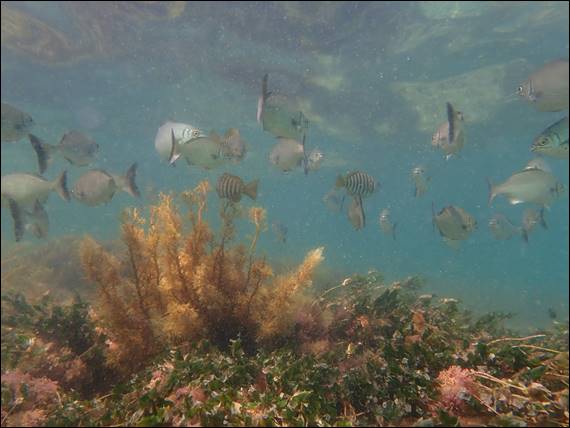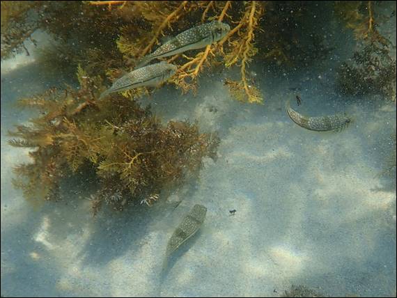 While the water column was filled with varying amounts of sand, as the sets of waves eased and then built up again I still spotted heaps of fish. Many species that I recognised and many I didn’t, way too many to list. Perhaps the variety and number of fish was due to the conditions, and they were sheltering in the shallows. I’ll definitely have to come back here in calmer conditions to see if that is the case. But also because the clarity made it pretty undesirable to snorkel right round the prominent rock on which many gannets were perched:
