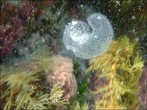 It was as if these molluscs were sheltering. Waiting for the water to settle, but I am sure they had just found a spot to rest for the day seeing they are nocturnal grazers. What I thought to be a jellyfish of some sort, shown in my fourth image, is in fact linked to molluscs but not those shown above. Being an egg sac from the small predatory Conical Sand Snail (Conuber conicum), in which you can see thousands of tiny eggs. These egg sacs are up to five times bigger than the snail that laid it, having swelled up by absorbing water after being laid: