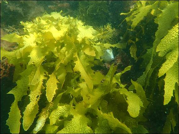 The fish were also out and about feeling braver. Allowing me to get that bit closer, or maybe it was that I was able to stay under a little longer. Sneaking up on them from the side, ambush style. Of the images my favourite are the above female Shaw’s Cowfish (Aracana aurita) with its deep red keel like belly, and below female Western Smooth Boxfish (Anoplocapros amygdaloides) that seemed to be play peekaboo with me. Both are boxfish, a family that also includes cofferfish and trunkfish. Cowfish being names due to the obvious horn like feature: