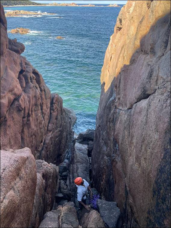 In past posts I’ve, maybe too often, talked of the fearsome reputation Smiths Beach holds. So I did wonder if he had remembered that when he suggested the location. On the plus side I really enjoy the climbing here, so was happy to pick off a few of the lower grade lines to make sure Josh had fighting chance on them. Despite getting the early sun, which was already up when we arrived, the two chimney like features on Harbour Wall were the obvious choice. Both of which Josh ate up even enjoying, I think, worming up The Drunken Sailor: