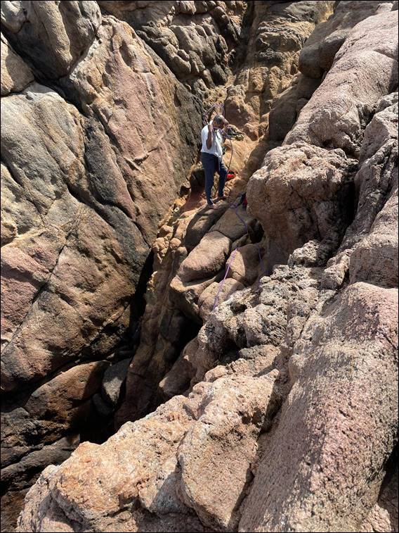 We then retreated to the narrower second zawn, which is afforded shade for a wee bit longer. Not that it was overly hot today, more so to allow us to keep the grades reasonable. This meant picking off a couple of routes I haven’t led for many years, and carefully eyed them up before committing. Below I am looking up at one of my routes called Deceptive Looks, which wasn’t too bad but I confess that it would scare the bejeebers out of any grade 13 leader. It was however the next route that played on my mind: