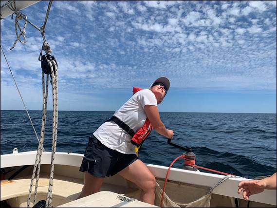 Emma was happy for Lisa and I to take the tiller for the entire trip, and it was so different to our chilled Saturday. Needing to be a bit more decisive and quicker with our decision making. We were also glad for the extra hands today from Sasha and Potsi, which really assisted as we went through ‘man overboard’ drills and other manoeuvres. And despite the need for constant vigilance of changes in the conditions, it was not stressful and we both really enjoyed the experience as well as all the banter and laughs: