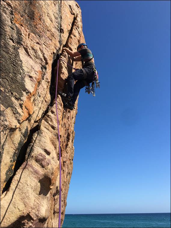 He could not recall playing on what is described in the guide as ‘a number of fun 6m chimneys and jamming cracks, some of which you need to traverse out over the water to get into. None are harder than grade 14’. With a low tide and very few of the mass of flies that often lurk in these cracks we played on for of the lines they offered. I had a bit of a blank and for some reason felt they were in the grade 6 to 8 range, but that was certainly not the case and it was also not true that Josh had not climbed any of them: