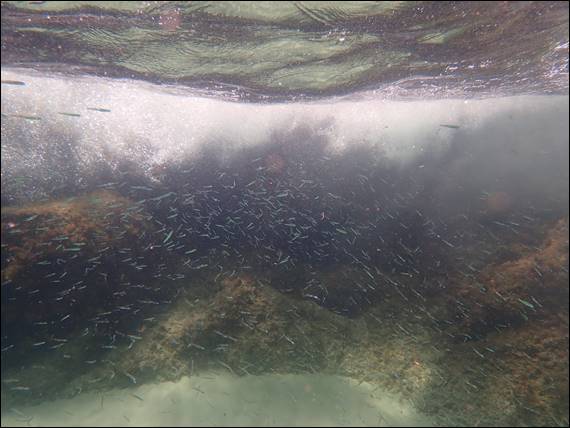 The winds were fresh and whipping along the coast line from the south. This was great to help cool us down while we were climbing in the sun, but it was chopping up the water. Still it looked pretty clear, so before we wrapped things up we went in for a dip. As soon as we were underwater we were surrounded by thousands of juvenile fish, often called fingerling. The water swept over the rocks filling the water with bubbles adding the sight. The waves were being driven by the winds and not a swell, so it felt quite comfortable bobbing about: