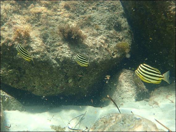It even felt like it wasn’t going to push us against the rocks, as I followed fish here and there. This was fortunate for another reason. Being New Year’s Eve the bay was full of boats and jet skis, whose wash added to the chop from the wind. So venturing too far out was likely to be perilous. The people in control of the vessels were highly unlikely to be observant enough to spot us. The whine of engines and propellers became background noise, unlike when there is only one vessel which makes you pop your head up to check there the danger lies: