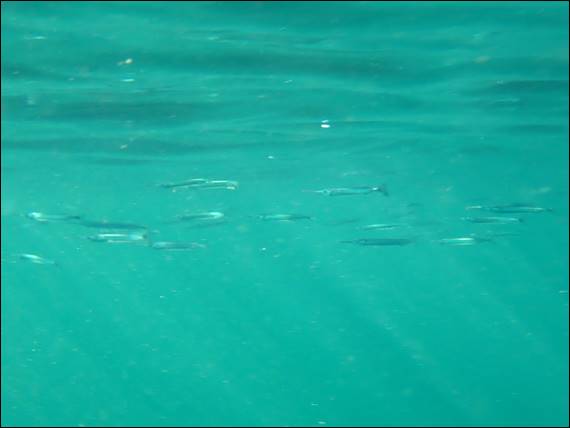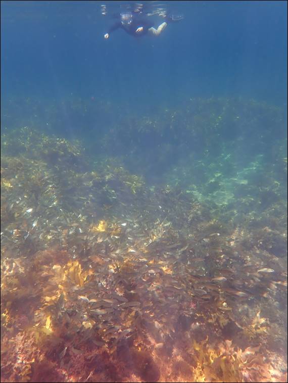 Eventually I started back, and here I came across smaller young Snapper, as shown two images up. Snapper are one of the most popular food and sport fish in southern Australia, growing to four feet, weighing up to twenty kilograms, and living to forty years old if they manage to avoid being caught. The ones I had seen were obviously very young. A school of young Southern Garfish (Hyporhamphus melanochir) also appeared. Keeping their distance, and like the Snapper I had seen these too were well below their full size of close to two feet: