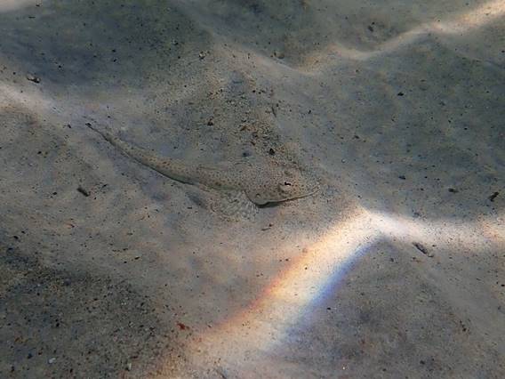 I thought that would put paid to Lisa’s snorkel, but it didn’t. Maybe because it was some way from where we were. She did however stay closer to shore, as I swam out, missing out on the shoal of Southern Calamari Squid (Sepioteuthis australis) a couple of images up. But when I came across a huge school Western Striped Grunter (Helotes octolineatus), and too her credit, she joined me several hundred meter out. We made our way back to shore where we saw a juvenile Northern Sand Flathead (Platycephalus endrachtensis), this time with a black fleck visible on the tail:
