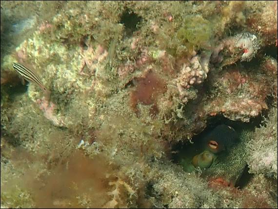 I gave it time to see if I missed something. Scouring the area and going down to check out the limited small bommies. Nothing jumped out and I eventually gave up, wondering what had caught the attention of the person we had seen. It took me a while to orientate myself and work out where my usual patch of reef was. Here I was rewarded with plenty to see. Included yet another Western Rock Octopus, this one was however content to watch me from the safety of its daytime hidey-hole. Making no effort to reach out and make contact: