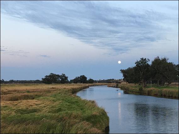 Geez, it feels good to be able to hop in the car and drive without needing to nervously listen for the thermo fan to kick in or the warning light to alert me that things are heating up. I’m way more alert as the driver than a passenger. So it was nice to be driving and putting all of my attention on everything around me, and not wasting any on the possibility of an engine issue. Such as the waning gibbous reflected in the water, as I crossed the Capel River. Being the phase of the moon as it transitions from full to half. This morning it was at 99% and looked particularly beautiful: