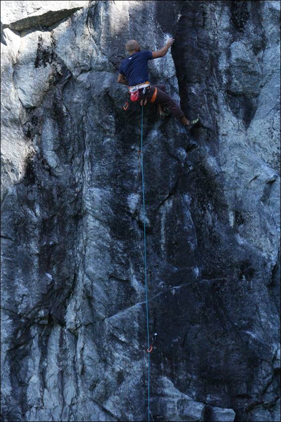 The closest I have come for the above one is that it may be a Pale-flecked Garden Sunskink (Lampropholis guichenoti). Whether it was or wasn’t, the kettle had boiled and we headed back to the rock. Howsie looked whacked, so I went back up the route and set it up as a top rope for him. To keep him company Pontus went up alongside him on Savage Sausage Sniffer, looking good right until the end. And just below the top is where they both hung. Looking up trying to muster up the energy to finish their respective climbs off, which they eventually did: