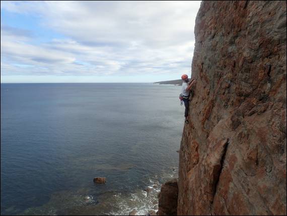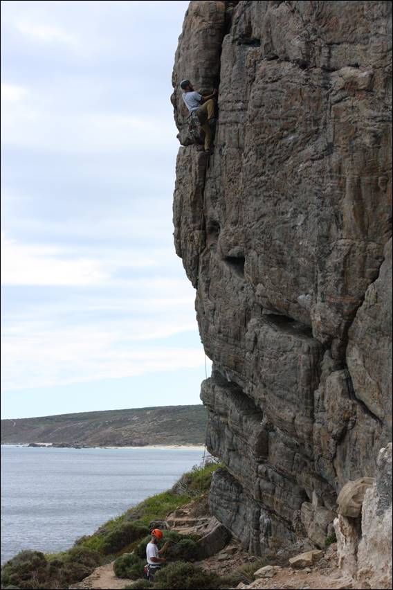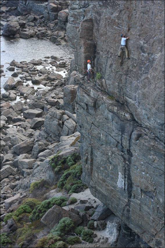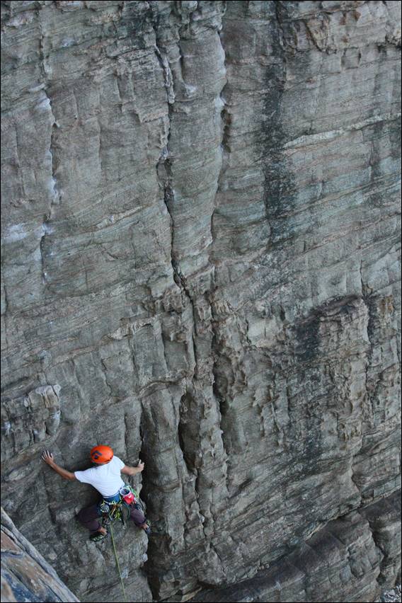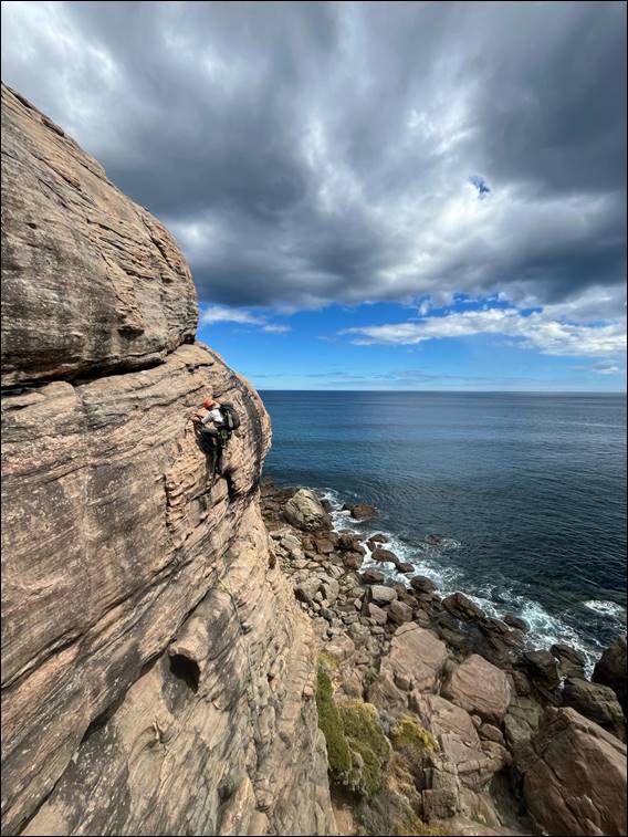 Quickly learning the hard way that we were not lying when we said the gneiss rock here had no porosity. Resulting in holds becoming quite a bit less desirable when you are sweating. It didn’t stop him taking on a grand bolted line, offering great images. It did however result in him slipping off the next line, as he followed Howsie up. I felt a little guilty. I was chatting away to him, as he slapped and then slipped off the rounded holds on the steep start of this climb. Due to the stretch of the rope that was above him, he fell all the way back down:
