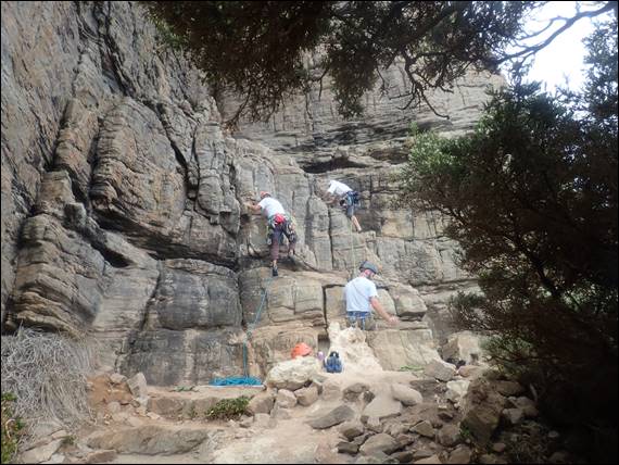 At least the elasticity of the rope tensioned as his feet touched the ground, so there was no harm done. No blame was laid after all we were both chatting, and on his next and successful attempt I didn’t say too much. Other than providing words of encouragement, to allow him to focus, as beads of sweat rolled down his face and coated his fingertips. It was as we were wrapping up from this route that Craig finally made it. He had told us it would be a late start for him, due to needing to get the kids off to school before he could make his way down: